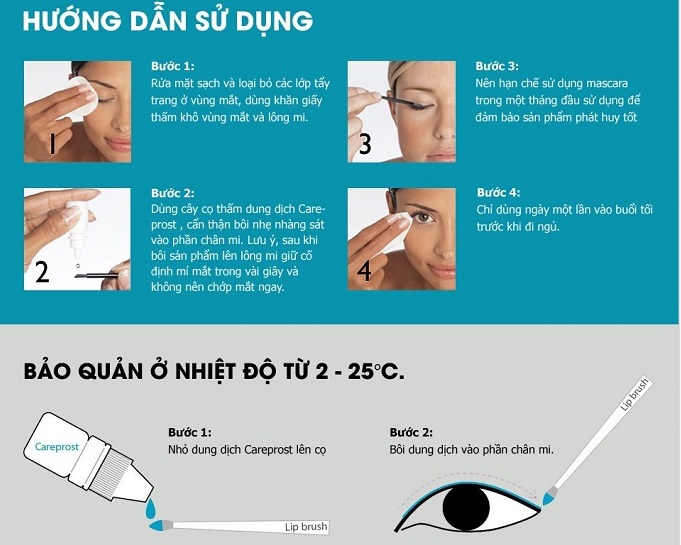 - Sử dụng 1 lần vào buổi tối trước khi ngủ. Sau khoảng 2 tháng, nên sử dụng sản phẩm dài mi careprost 2 -3 lần/tuần.